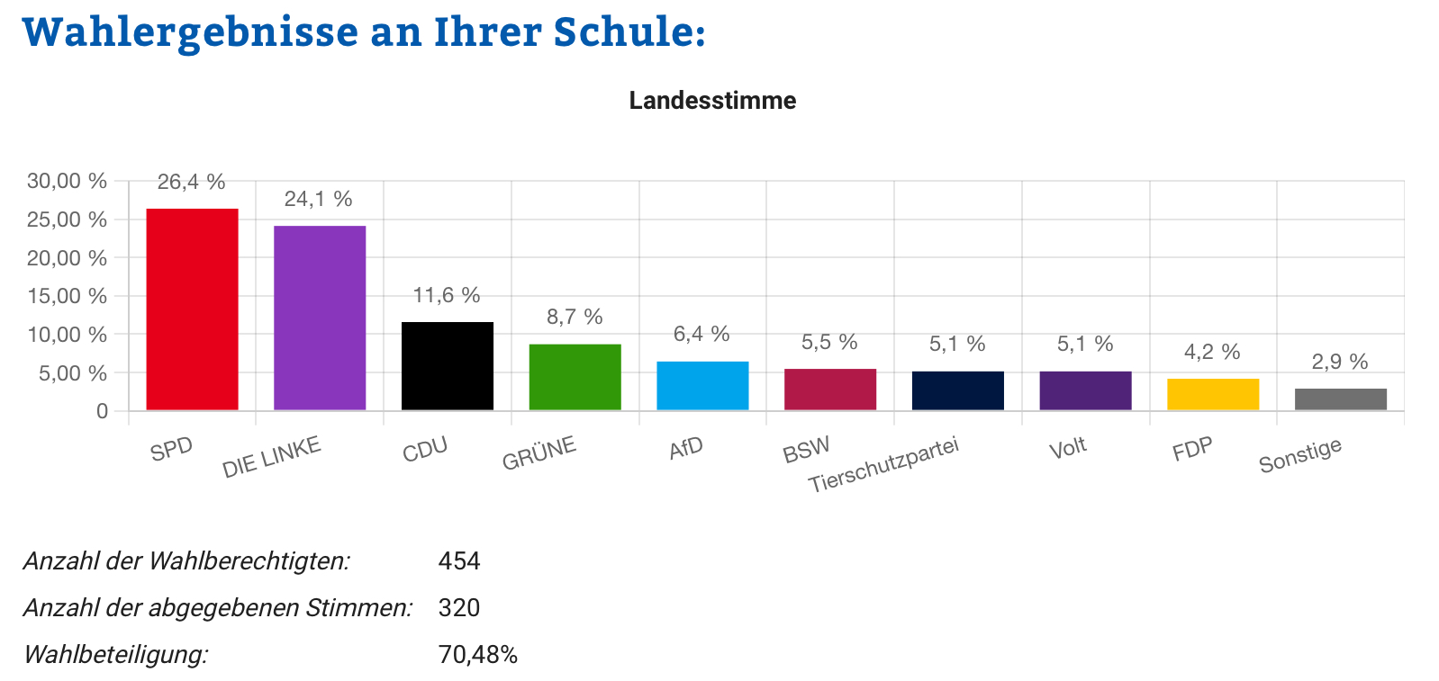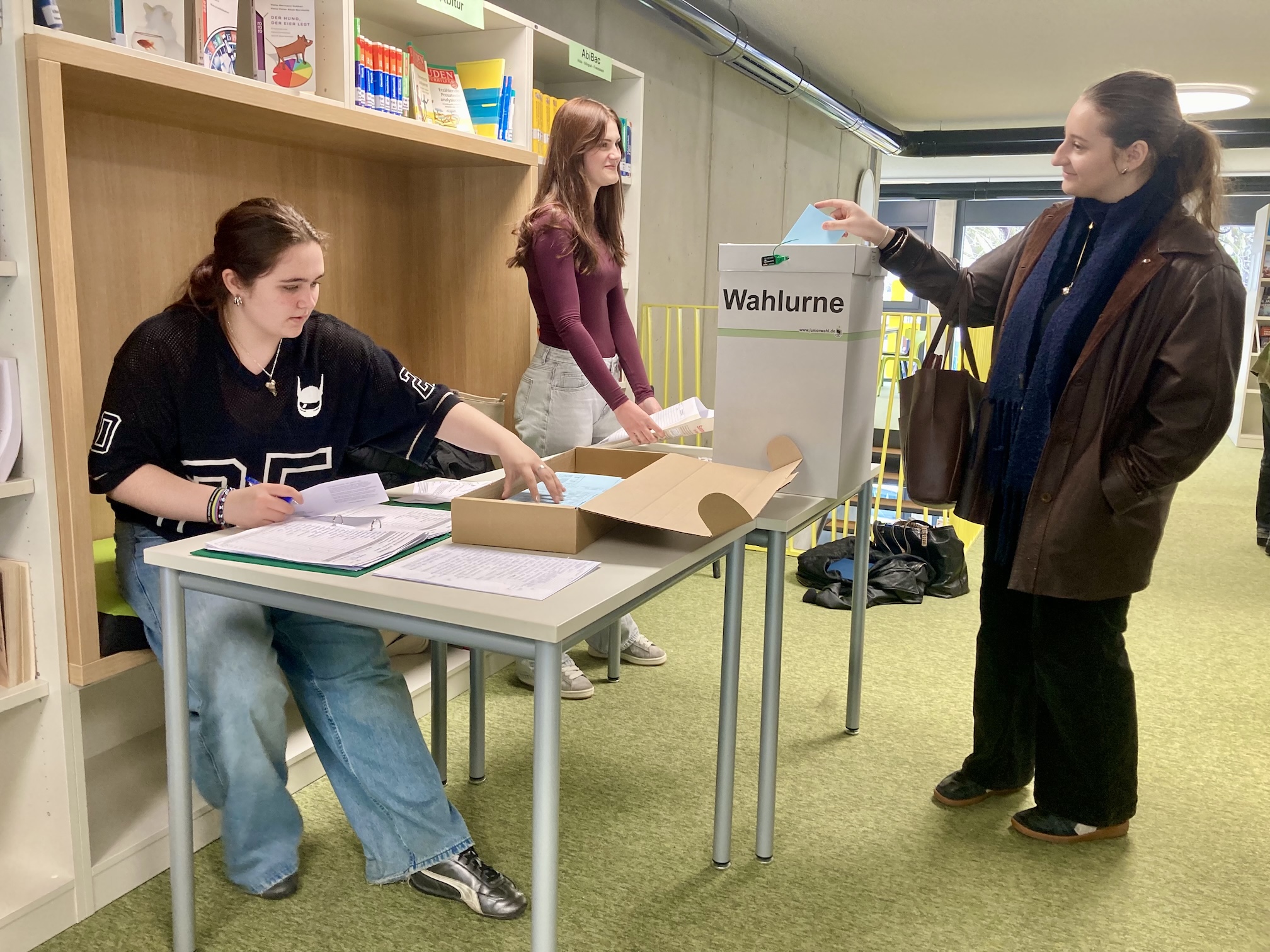 Das Wahlbüro hatte am Wahltag selbst von 7:30 bis 13:30 Uhr geöffnet, so dass die Schülerschaft flexibel vor, nach oder während dem Unterricht bzw. Freistunden oder eben auch vor oder nach Schulbeginn bzw. in den Pausen wählen gehen konnte. Im Rahmen dieses Konzeptes sind wir sehr stolz auf die Wahlbeteiligung von über 70 %.